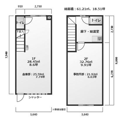 【1F】倉庫:28.45㎡【2F】事務所:32.76㎡ 【駐車場】1台無料 |